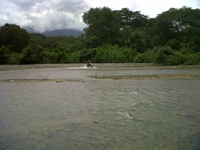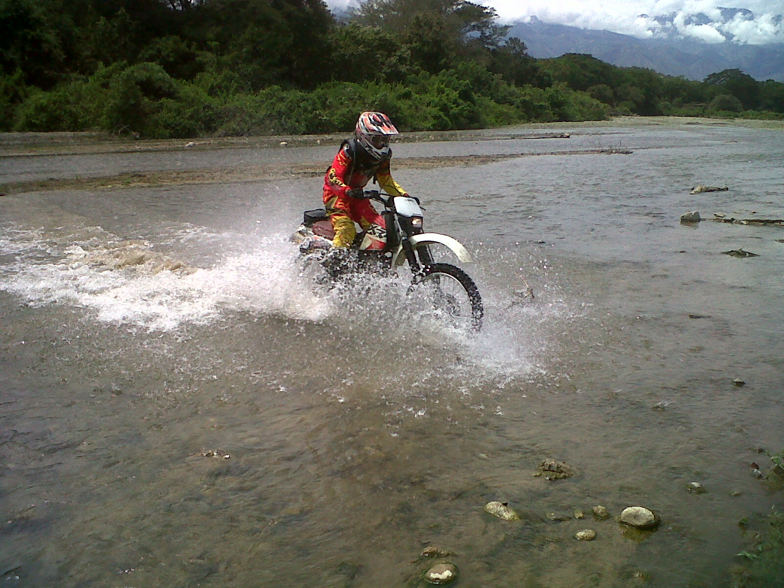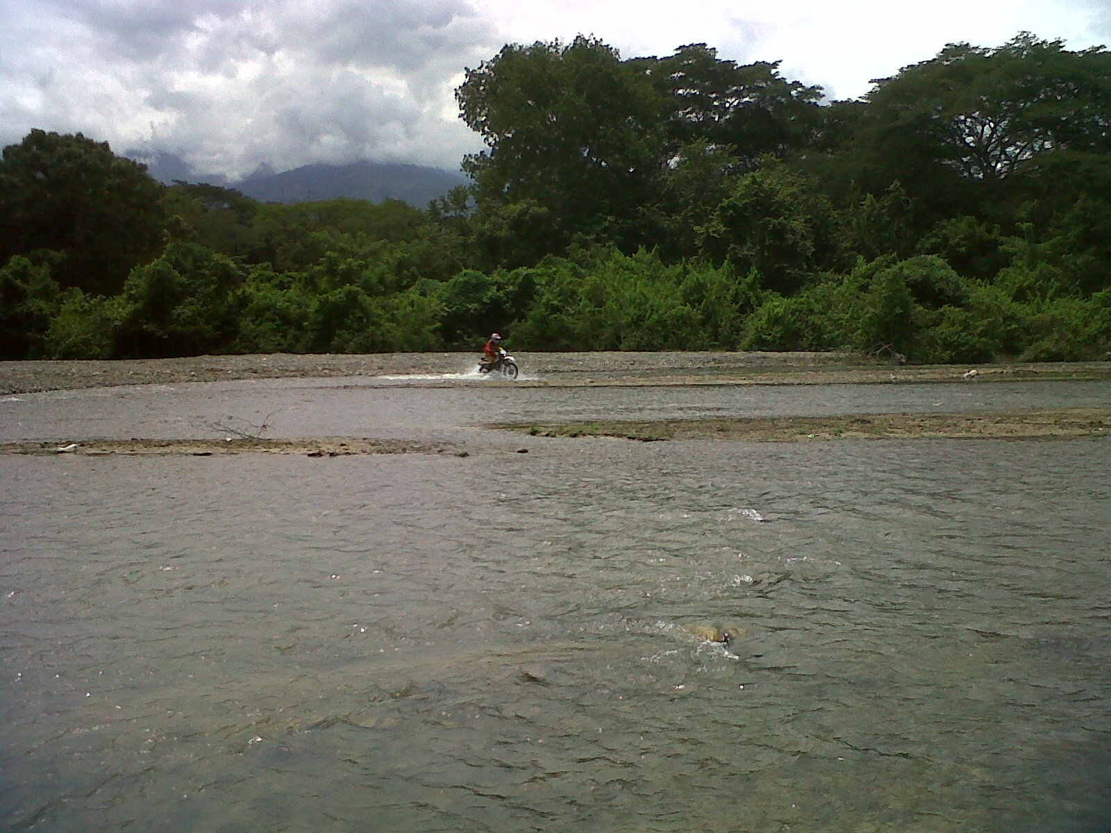 De ahí en adelante la carretera es muy buena, es un destapado normalito. Llegamos a Sopetran, nos tomamos una foto y seguimos por un camino para salir al río, donde seguimos río arriba para salir al Gaitero, fueron varios kilometros de lujo, pero al final a la moto de Daniel le agarro una apagadera y a duras penas logramos sacarla a la carretera, de ahí seguimos por la pavimentada hasta el Gaitero, ahí descansamos, dejamos enfriar la moto, pedimos aceite y la fuliamos, ah!, y nos comimos otro sanduche.