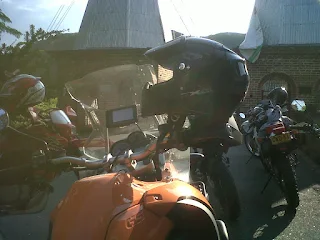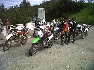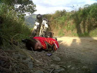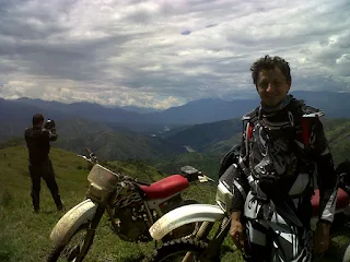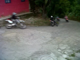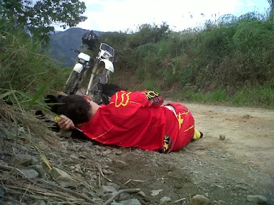 Y arrancamos para Ebejico, a donde llegamos sin mayores contratiempos, tanqueamos y seguimos a eso de las 3 de la tarde, y a unos 5 kilometros de sevilla, yo iba adelante, y en una curva nos encontramos un campero, yo pase normal cuando más adelante mire hacia atrás y no venía Daniel, cuando me devolví y lo vi tirado ahí en el piso con la moto encima (debo confesar que sude frío), pero no le paso nada, se cayo solo, la moto si no pudo seguir, se le torció el disco del freno delantero y pues toco llamar a Juan para que fuera por nosotros en el Toyota. Lo llamamos como a las 3:40 PM y llego a eso de las 6:00 PM... Pero bueno, fue una gran salida, y fue la segunda que intetamos hacer por ese lado y no logramos terminar... La tercera será la vencida.