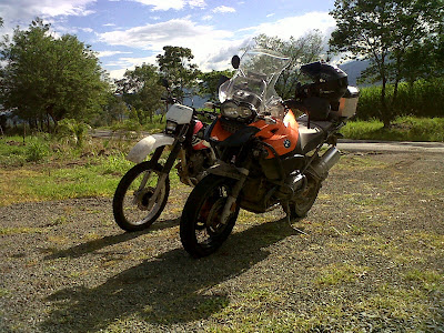 La idea de salir por Bolombolo fue para sacarle el cuerpo al tráfico de la vía normal a la pintada. La primera parada la realizamos en el alto de minitas, donde nos tomamos un jugo de naranja y repasamos de nuevo el checklist de manejo, esto viene al caso ya que cuando arrancamos ahí adelante, fue el primer susto, se le resbaló la llanta delantera en un arenero; después de eso llegamos sin problema a Bolombolo, donde tanquiamos (repostamos gasolina), y de ahí para La Pintada, donde llegamos a almorzar a eso de las 12:00. Salimos como a la 1:00 PM, para Supía donde volvimos a tanquear y nos fuimos por ahí ya que la carretera es más entretenida. Todo transcurrió tranquilamente, llegamos a la entrada para La Virginia a eso de las 4, tomamos algo y luego paramos de nuevo donde se une la carretera con la que va para Cartago, comimos piña y salimos para Santa Rosa, con tan mala suerte que por Pereira nos cogió un aguacero de padre y señor mío, paramos a escamparnos y llegamos a Santa Rosa a las 6:00 PM, guardamos la moto y a comer Chorizo Santarosano, y a descansar.